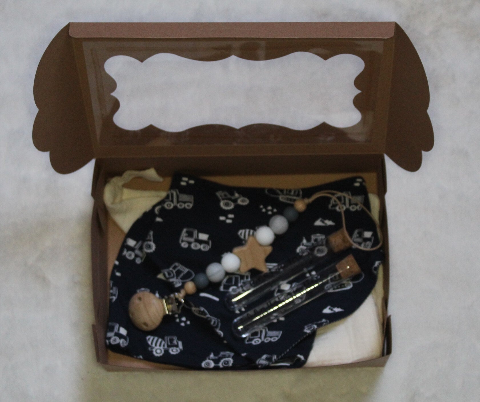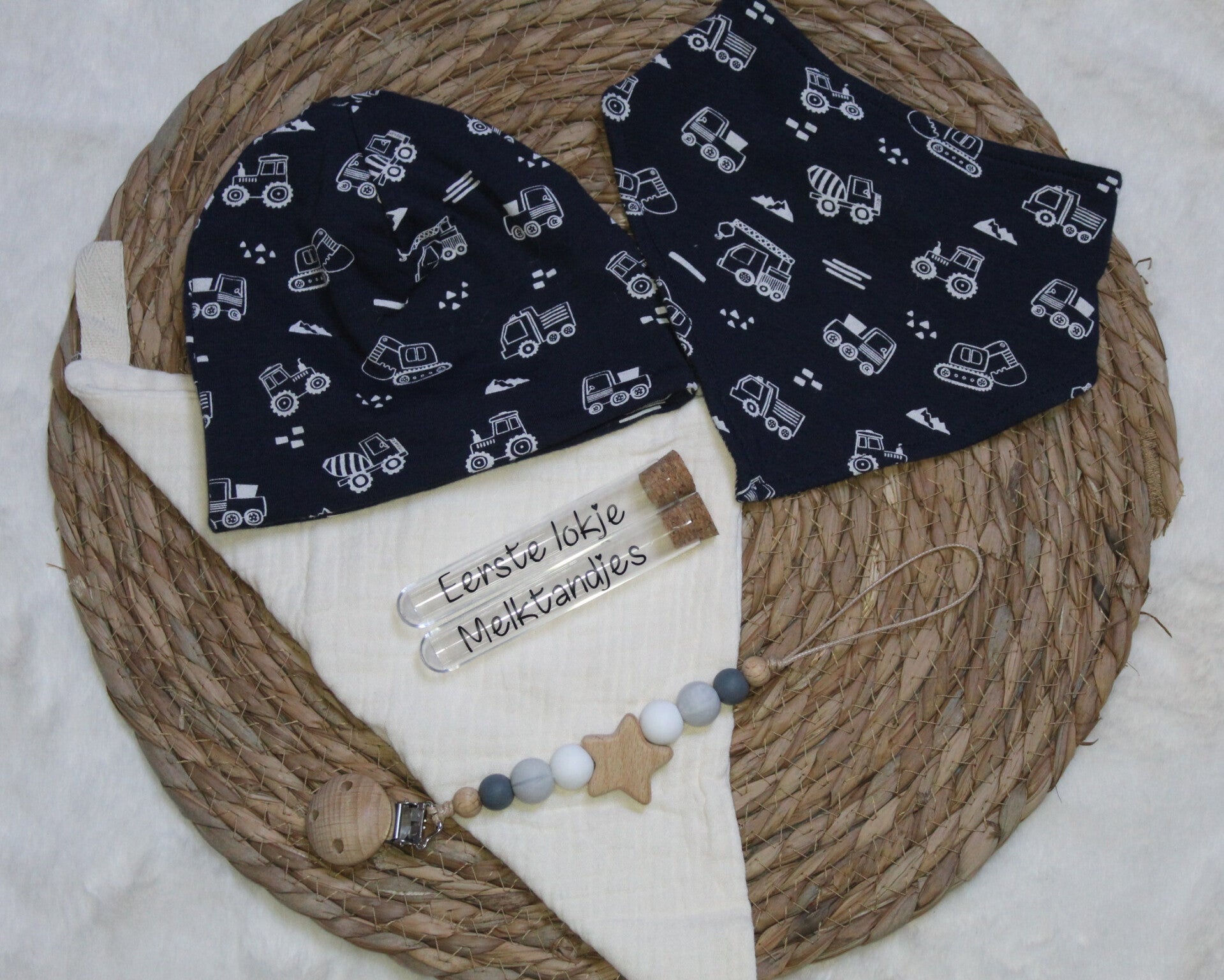 Mutsje en slab, doekje, bewaarbuisjes en speenkoord